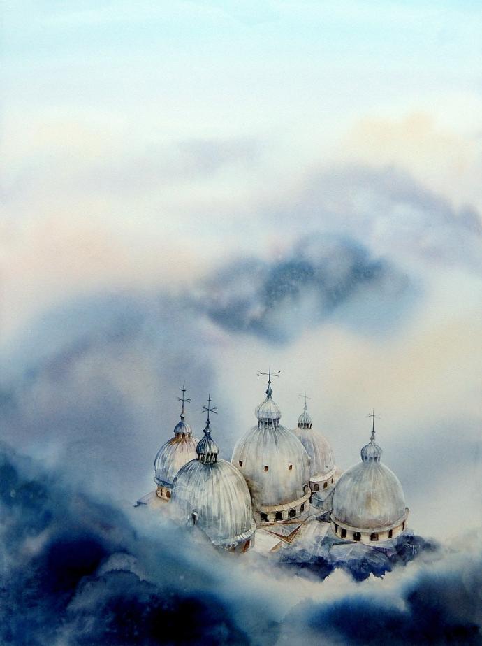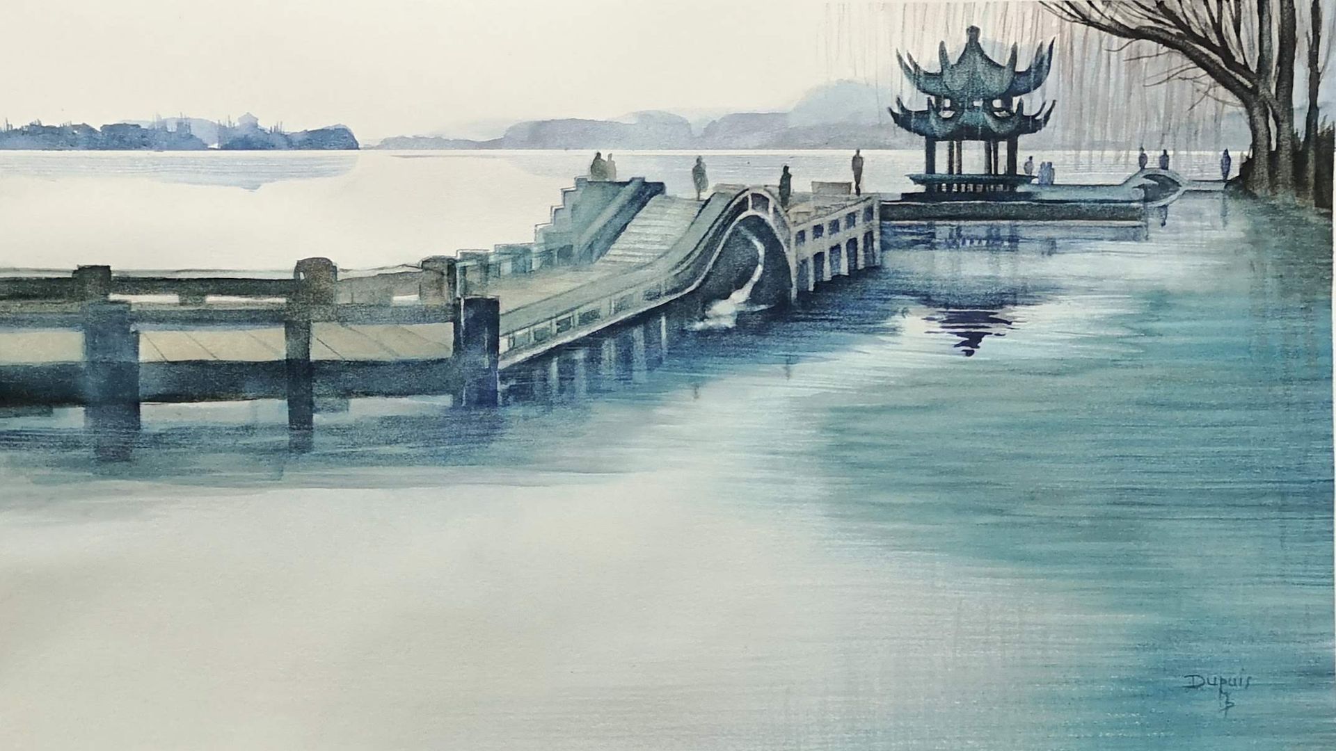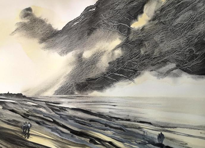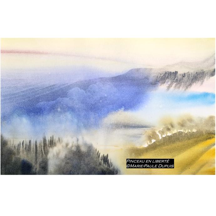 On peut poser le graphite d'abord, définissant les valeurs tonales . Le lavis d'aquarelle posé ensuite donne une légère brume.