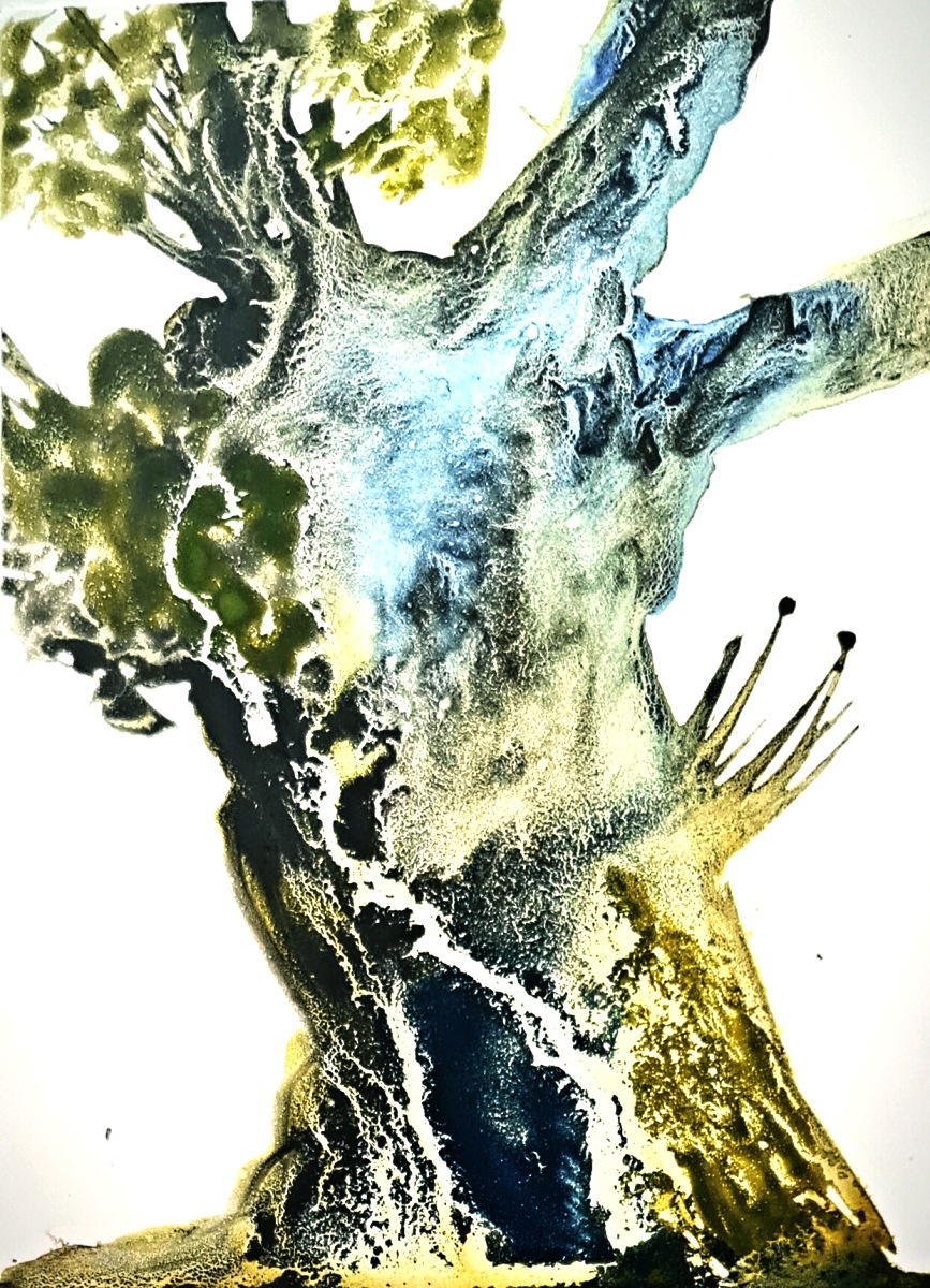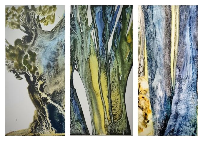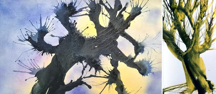 Le graphite et l'aquarelle se mêlent allègrement sur le papier pour sculpter les troncs .
