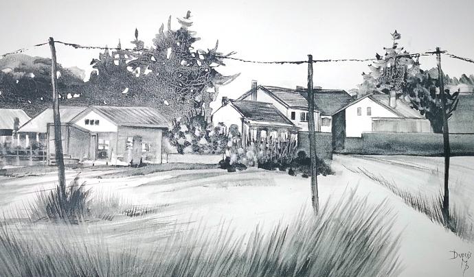 Le graphite peut se travailler seul dans l'eau, en monochrome, en veillant à garder une variation dans les tonalités. Le résultat donne des aquarelles évoquant le passé, à la fois douces et texturées.